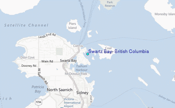 Use this relief map to navigate to tide stations, surf breaks and cities that are in the area of Swartz Bay, British Columbia.