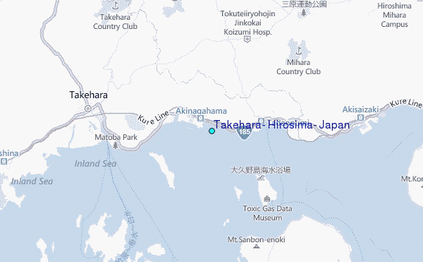 Use this relief map to navigate to tide stations, surf breaks and cities that are in the area of Takehara, Hirosima, Japan.