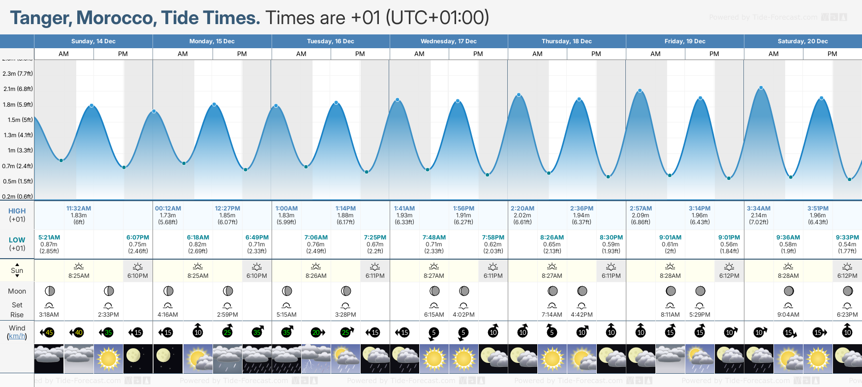 Tide Times are +01 (UTC +1.0hrs). Last Spring High Tide at Tanger was on Sat 06 Dec (height: 2.40m 7.9ft). Next high Spring Tide at Tanger will be on Sun 21 Dec (height: 2.17m 7.1ft).