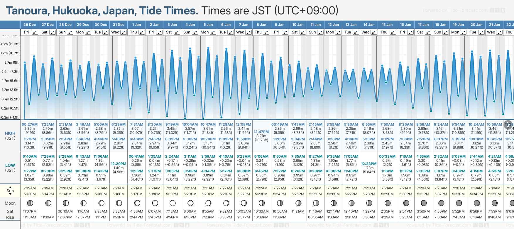 December and January Tide charts for Tanoura: The tide charts below show the height, time and date of high and low tides for the next 30 days.