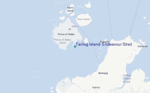 Use this relief map to navigate to tide stations, surf breaks and cities that are in the area of Tarilag Island, Endeavour Strait.