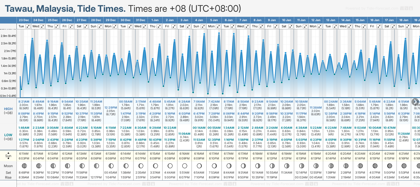 December and January Tide charts for Tawau: The tide charts below show the height, time and date of high and low tides for the next 30 days.