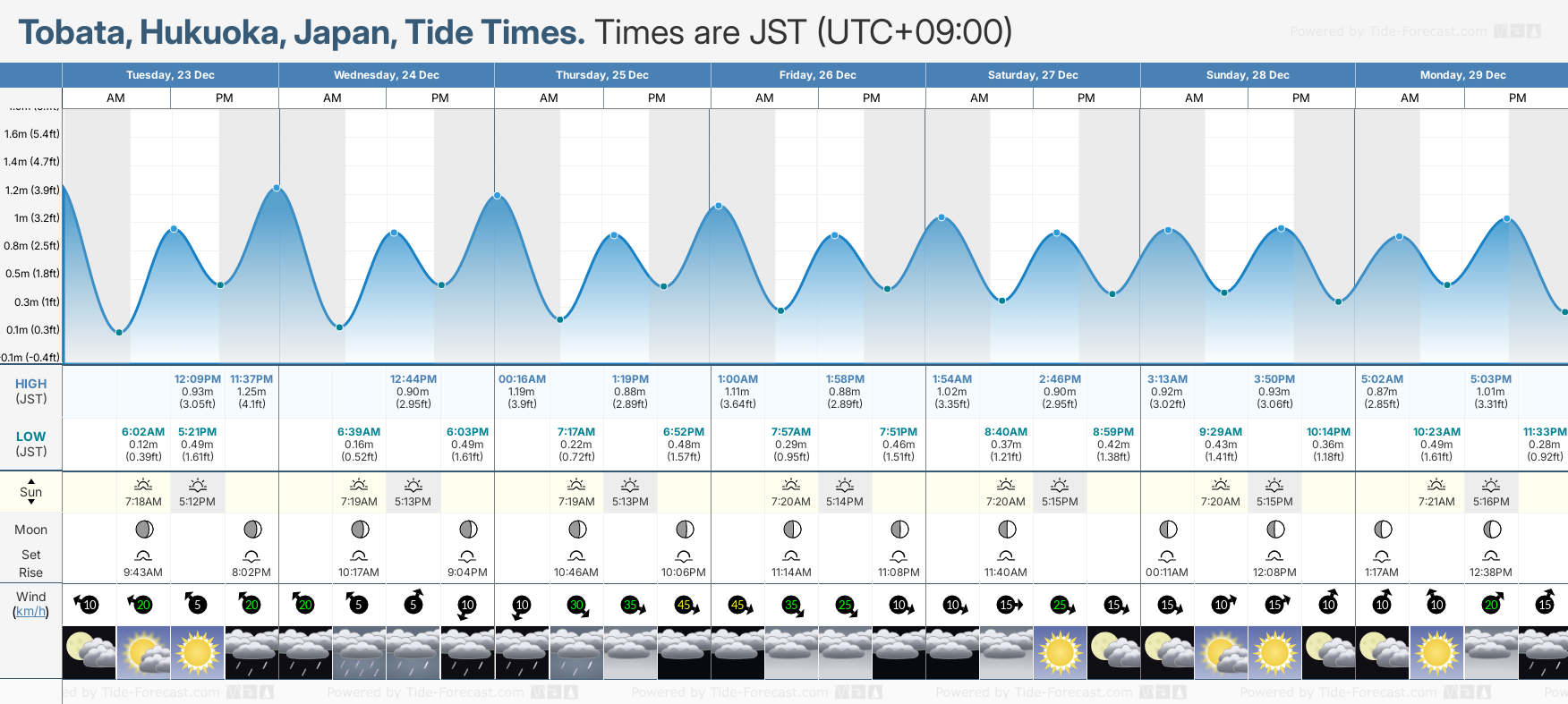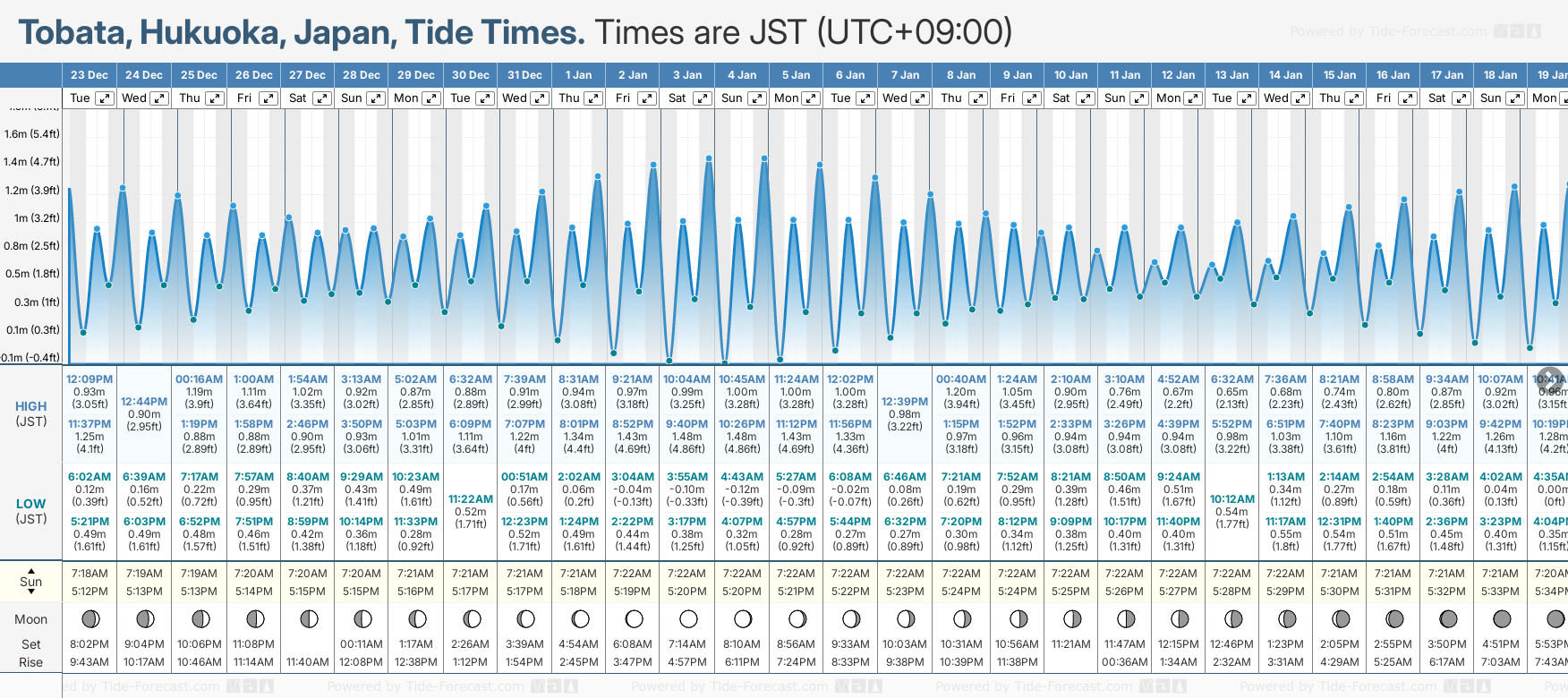 December and January Tide charts for Tobata: The tide charts below show the height, time and date of high and low tides for the next 30 days.