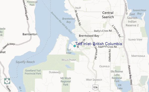Use this relief map to navigate to tide stations, surf breaks and cities that are in the area of Tod Inlet, British Columbia.