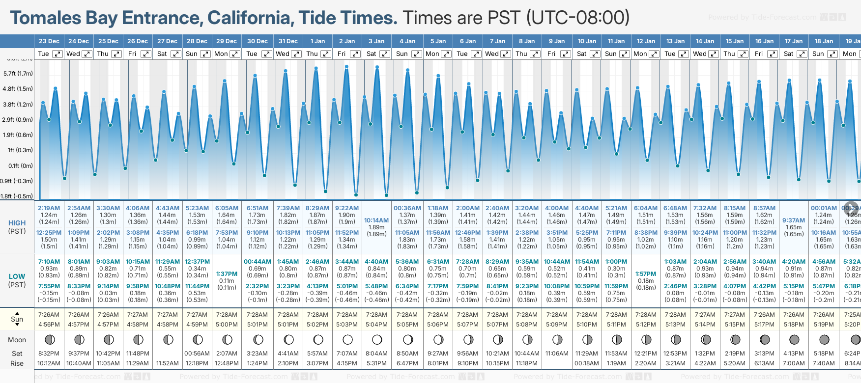 December and January Tide charts for Tomales Bay Entrance: The tide charts below show the height, time and date of high and low tides for the next 30 days.