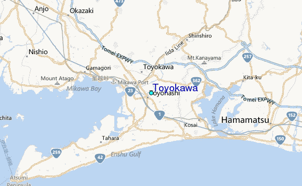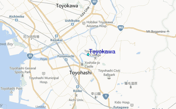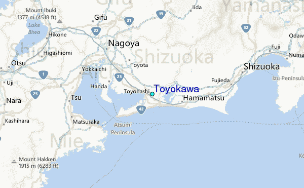 Use this relief map to navigate to tide stations, surf breaks and cities that are in the area of Toyokawa.
