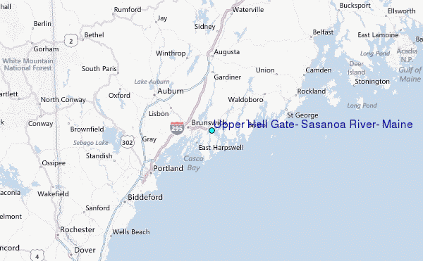Use this relief map to navigate to tide stations, surf breaks and cities that are in the area of Upper Hell Gate, Sasanoa River, Maine.