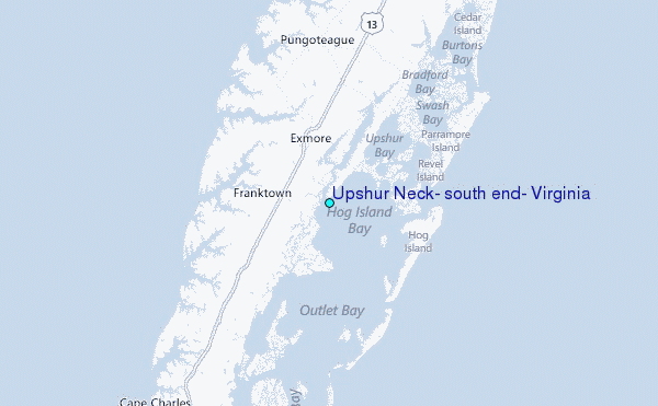 Use this relief map to navigate to tide stations, surf breaks and cities that are in the area of Upshur Neck, south end, Virginia.