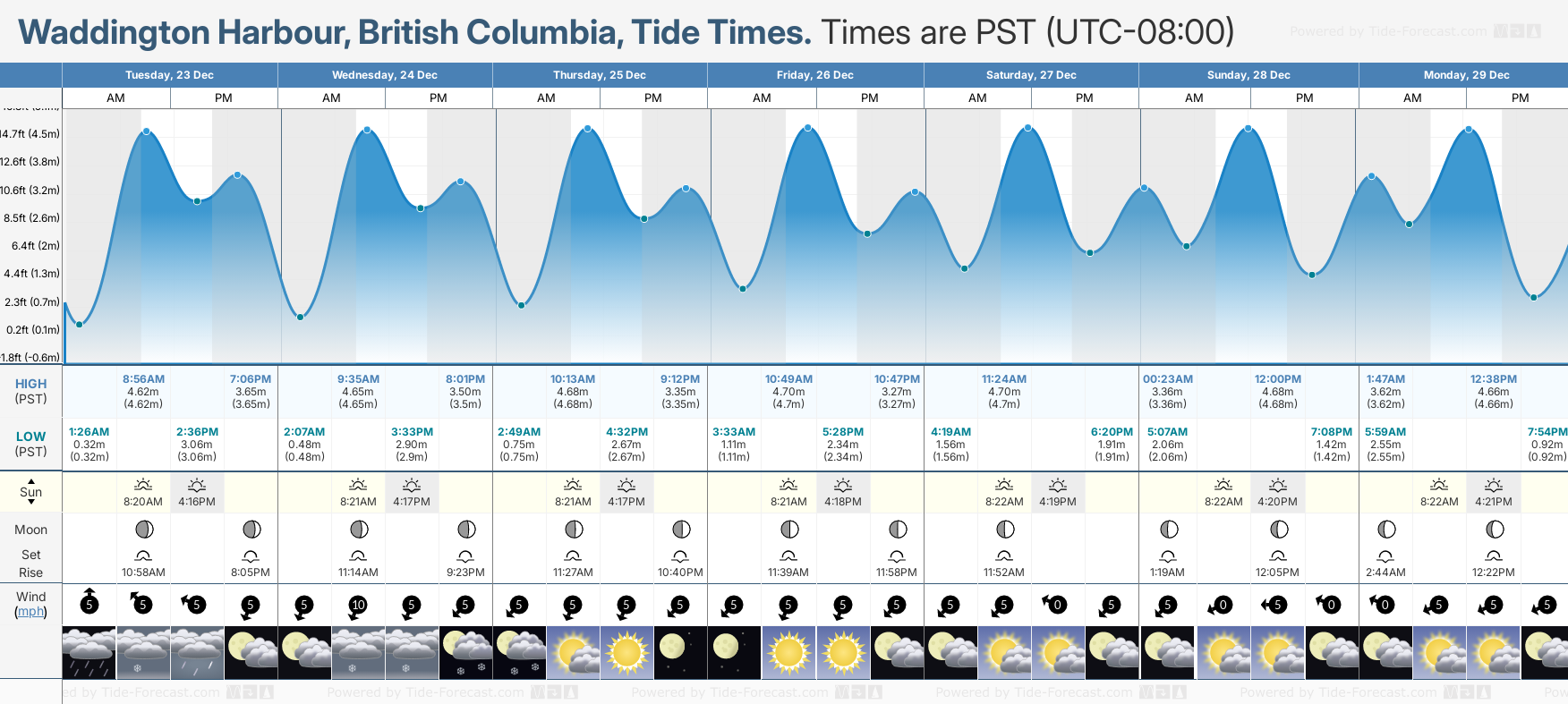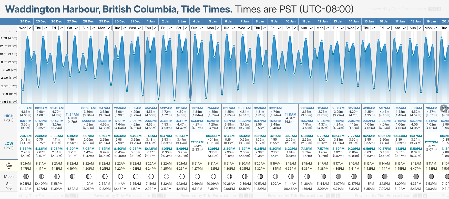Tide Times are PST (UTC -8.0hrs). Last Spring High Tide at Waddington Harbour was on Fri 05 Dec (height: 4.82m 15.8ft). Next high Spring Tide at Waddington Harbour will be on Fri 26 Dec (height: 4.70m 15.4ft).