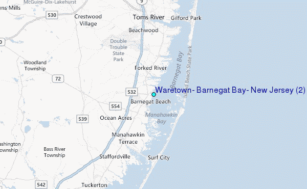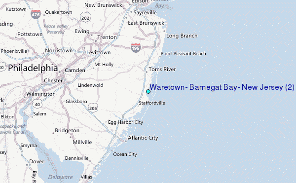 Use this relief map to navigate to tide stations, surf breaks and cities that are in the area of Waretown, Barnegat Bay, New Jersey (2).