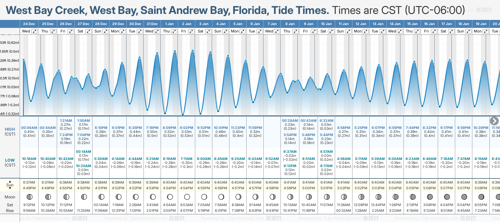 December and January Tide charts for West Bay Creek, West Bay, Saint Andrew Bay: The tide charts below show the height, time and date of high and low tides for the next 30 days.