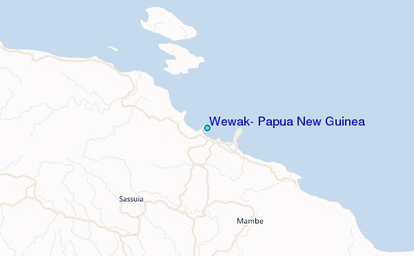Use this relief map to navigate to tide stations, surf breaks and cities that are in the area of Wewak, Papua New Guinea.