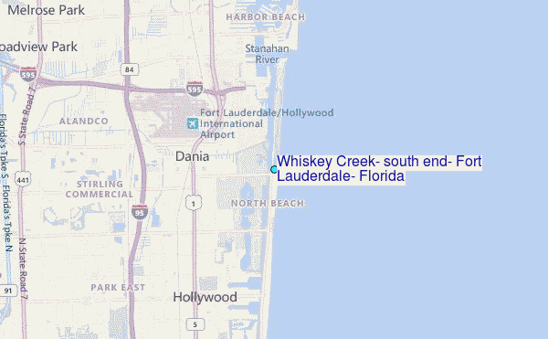 Use this relief map to navigate to tide stations, surf breaks and cities that are in the area of Whiskey Creek, south end, Fort Lauderdale, Florida.