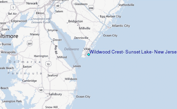 Use this relief map to navigate to tide stations, surf breaks and cities that are in the area of Wildwood Crest, Sunset Lake, New Jersey.