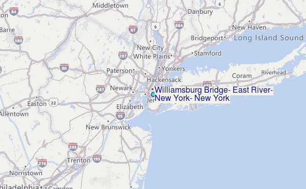 Use this relief map to navigate to tide stations, surf breaks and cities that are in the area of Williamsburg Bridge, East River, New York, New York.