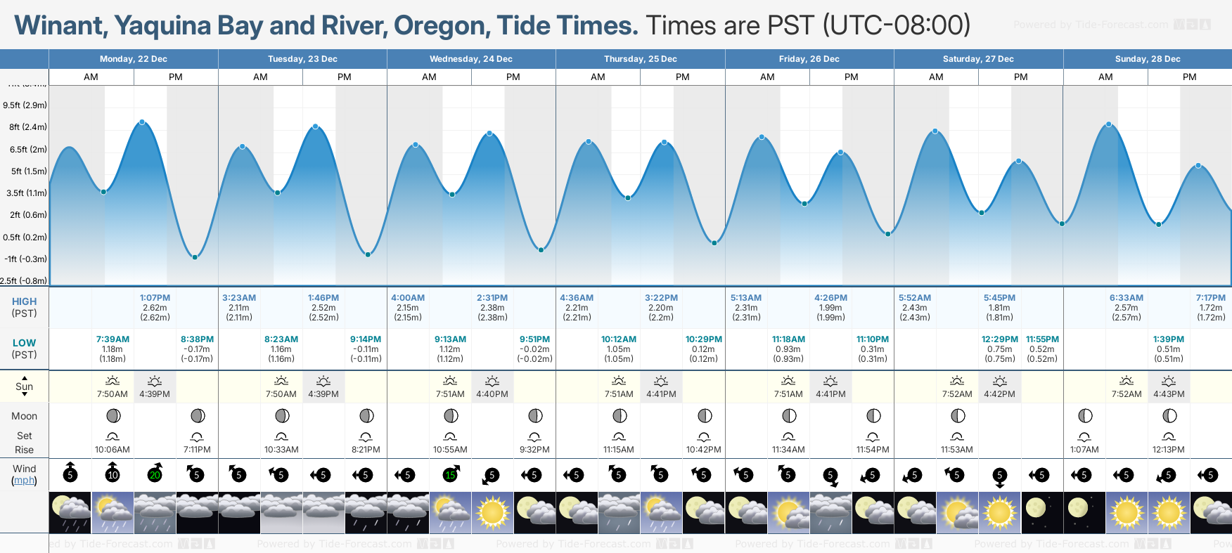 December and January Tide charts for Winant, Yaquina Bay and River: The tide charts below show the height, time and date of high and low tides for the next 30 days.