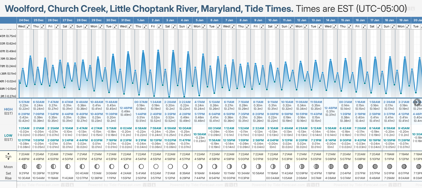 December and January Tide charts for Woolford, Church Creek, Little Choptank River: The tide charts below show the height, time and date of high and low tides for the next 30 days.