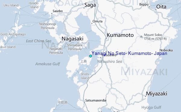 Use this relief map to navigate to tide stations, surf breaks and cities that are in the area of Yanagi No Seto, Kumamoto, Japan.