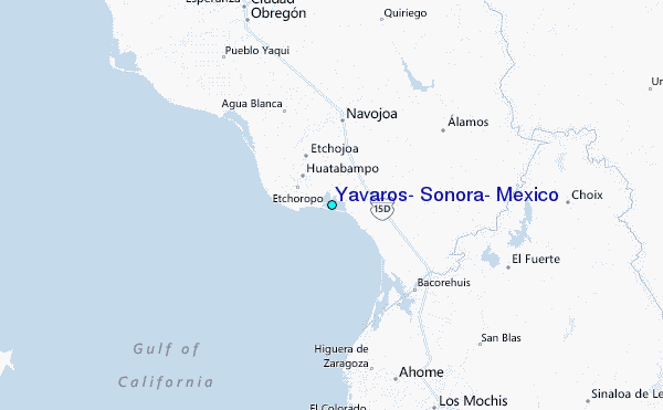 Use this relief map to navigate to tide stations, surf breaks and cities that are in the area of Yavaros, Sonora, Mexico.