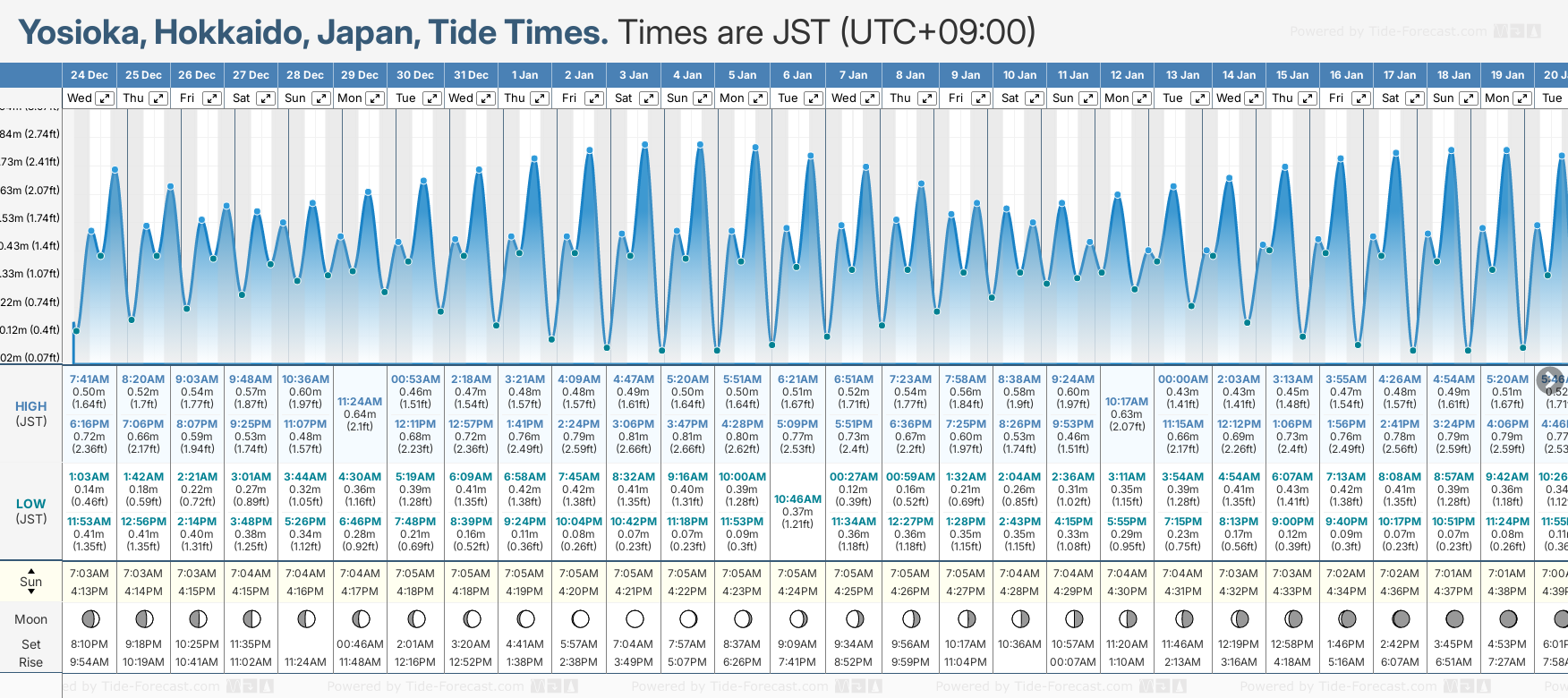 December and January Tide charts for Yosioka: The tide charts below show the height, time and date of high and low tides for the next 30 days.